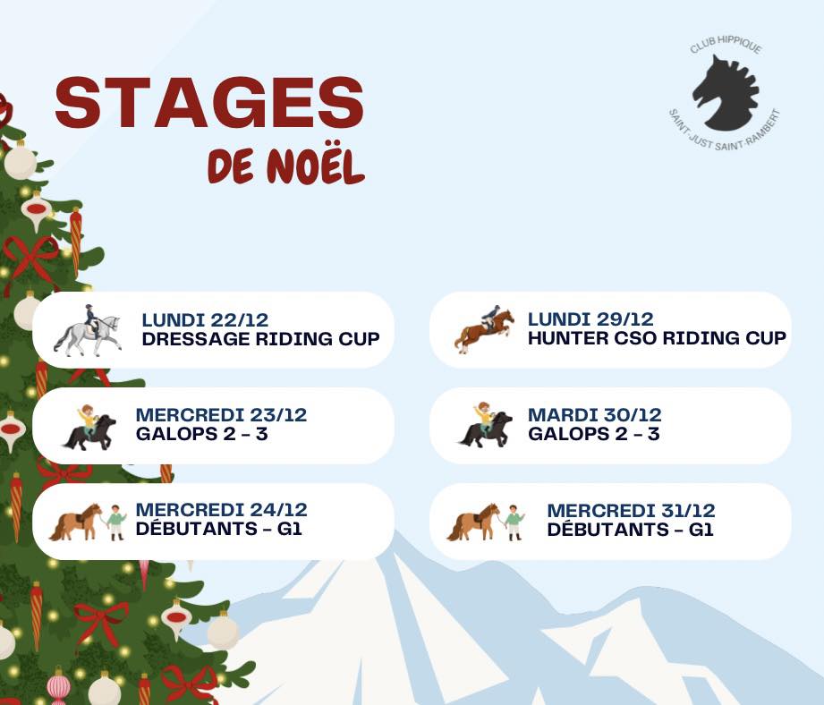 C’est parti pour les stages des vacances de Noël, du 22 au 31 décembre.Des journées pour tous les niveaux, inscriptions sur Kavalog ou sur l’agenda. Retour de la RidingCup : dressage et hunter, deuxièmes étapes du challenge !